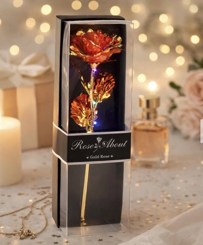 Elegáns aranyszínű díszrózsa átlátszó ajándékdobozban, finom LED világítással. Tartós, romantikus ajándék Valentin napra, évfordulóra vagy különleges alkalomra. Méret kb.: 25–28 cm magas |