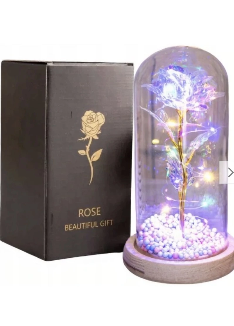 Elegáns, különleges ajándék LED fényfüzérrel megvilágított örök rózsával, üveg búra alatt. A kristályhatású virág és az arany szár exkluzív megjelenést biztosít, így romantikus és ünnepi alkalmakra is tökéletes ajándék. Hangulatos dekoráció nappaliba, hálószobába vagy ajándékként Valentin-napra, évfordulóra, születésnapra.